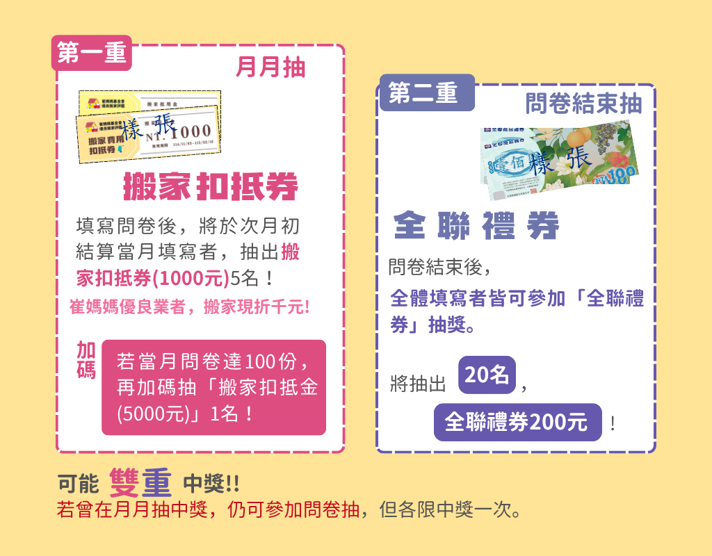 加碼條件:若該月有效問卷達 100 份,另加抽「搬家扣抵金 NT$5,000」× 1 名